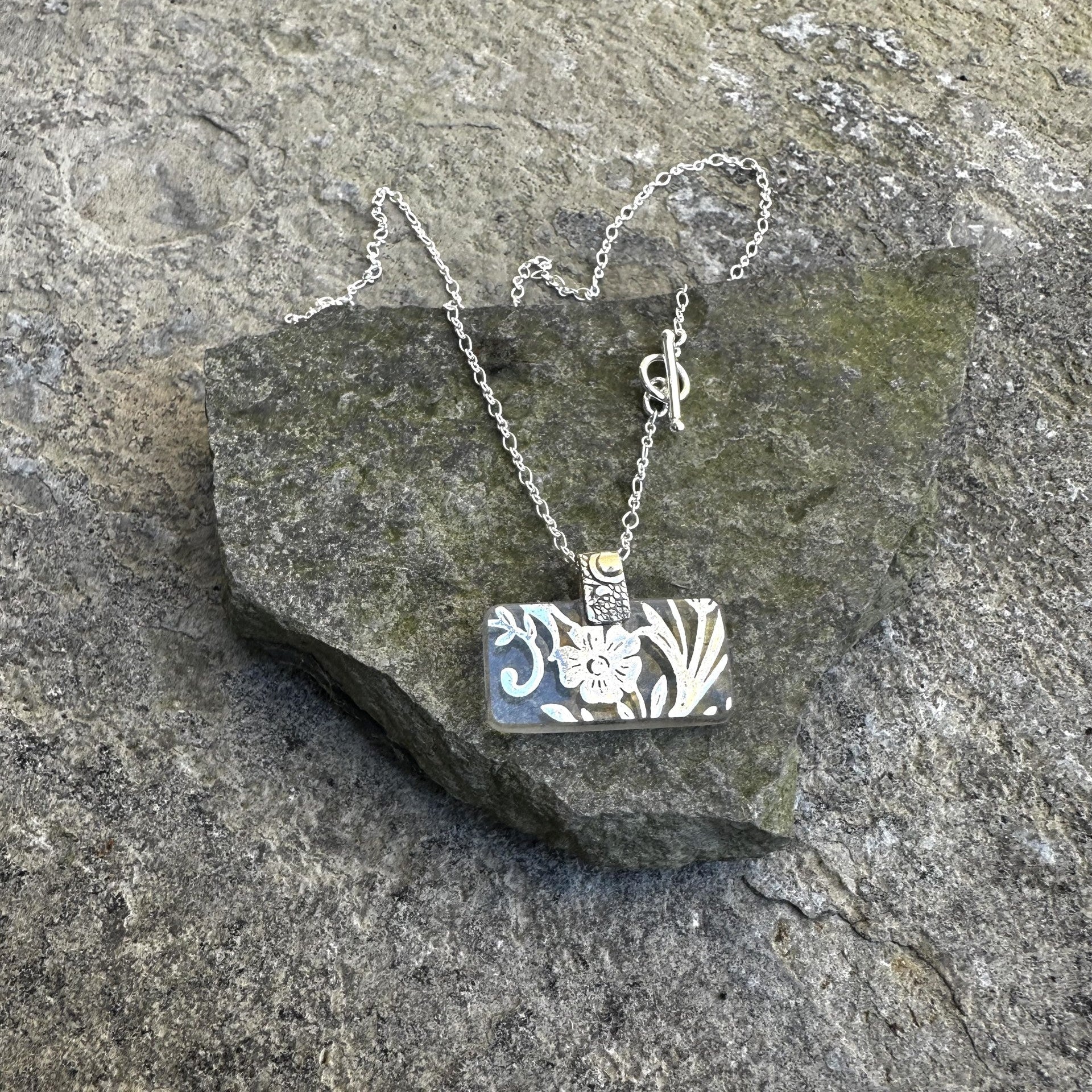 Small rectangle pendant made from an antique glass plate with sterling silver overlay showcasing the cutest little flower among foliage.